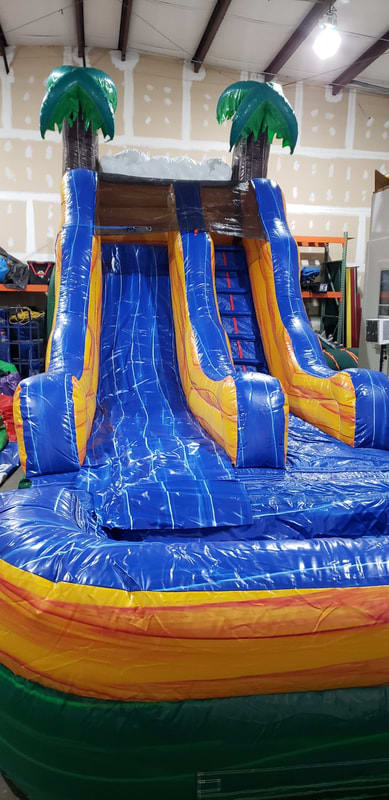 This tropical waterslide with splash pool has slip resistant walk/stairs area for safer play. Hey Hixson TN check out this great waterslide for your kid's next party! Signal Mtn TN your party goers can feel like they are climbing to the tops of the cliff to reach the highest palm trees and then slide down water-colored waterfall to the cool splash pool below!