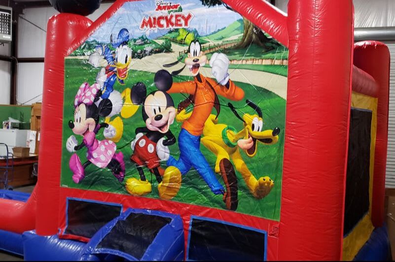 New for 2022! Mickey and Friends combo sure to be a hit! This combo offers bounce area, climb, slide and inside basketball hoop! Hixson TN and surrounding areas looking for Mickey Mouse themed birthday party bounce house then you found it! Running Wild Inflatables has you covered. Easy booking online with the tab below.