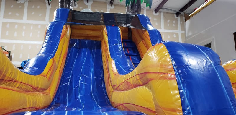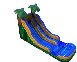 This tropical waterslide with splash pool has slip resistant walk/stairs area for safer play. Hey Hixson TN check out this great waterslide for your kid's next party! Signal Mtn TN your party goers can feel like they are climbing to the tops of the cliff to reach the highest palm trees and then slide down water-colored waterfall to the cool splash pool below!